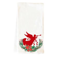 This decorative white flour sack tea towel features a red silhouette image of an Angel surrounded by red and green laurels and ornamented with Poinsettia on the bottom.. Made of 100% cotton, it measures ...