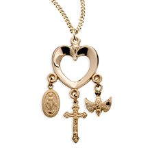 Measures 5/8” x 1½”. Open heart with tiny Miraculous medal; Crucifix; and Holy Spirit dove pendant attached. 16kt Gold over solid sterling silver. Medals are die struck. Hand polished and engraved by New England ...