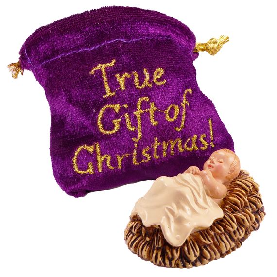 This is a perfect way to remind children and adults alike of the true meaning of Christmas. A small resin statue of the Infant Jesus in a crib comes in a soft purple pouch stitched with the words: "True Gift of Christmas!" Baby Jesus in crib measures 2".