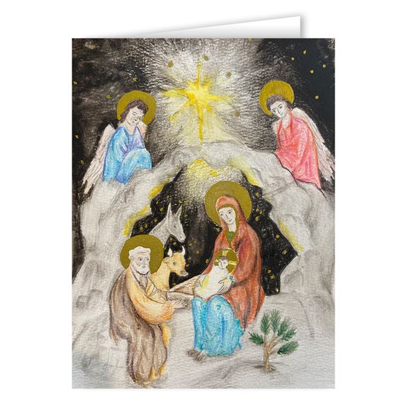 This card features the artwork of 12 year old Iris - a member of the Children's Rosary® which is a Prayer Group Movement for Children. The card was inspired by Ukrainian Catholic paintings of the Nativity.