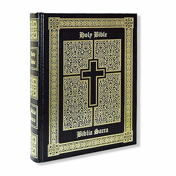 Douay-Rheims and Clementina Vulgata texts are bound side-by-side in this handsome edition. The Clementine Vulgate was proclaimed the official Latin Bible of the Church after the Reformation. The Douay-Rheims version is a translation of the Latin text. Having both Bibles side by side allows us to see exactly where the vernacular translation came from. The hard cover is bound in gold embossed black leather with gilded pages and two ribbon place markers. Measures 8½” x 11½”.