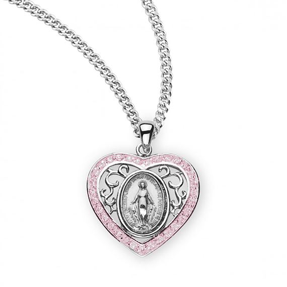 This sterling silver heart shaped Miraculous medal pendant features 31 pink cubic zirconia accents around the perimeter with a delicate filigree fill between the open space and the oval Miraculous medal in the center.