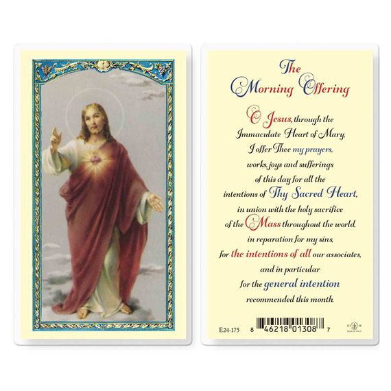This prayer card features an image of Our Lord Jesus on the front and on the reverse is the Morning Offering. The prayer reads, "O Jesus, through the Immaculate Heart of Mary, I offer Thee my prayers, works, joys and sufferings of this day for all the intentions of Thy Sacred Heart, in union with the holy sacrifice of the Mass throughout the world, in reparation for my sins, for the intentions of all our associates, and in particular for the general intention recommended this month". This laminated card measures 2 1/2" x 4 1/2".