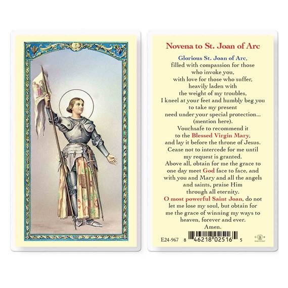 This prayer card features the Novena to St. Joan of Arc. The prayer begins,