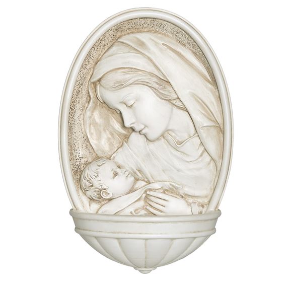 This beautiful holy water font features a large low-relief sculpture of the Our Lady and Jesus with remarkable detail. Made of a resin-stone mix, this font measures 7½”H x 5"W with a 1¼” deep basin and a key-hole hook on the back for hanging.
