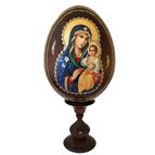 This solid wood egg has a dark brown stained finish with a decoupage image of the Virgin and Child, under the title of Virgin “Seeker of the Perished”, on the front surrounded by decorative gold detailing. Because each egg is individually handmade, the gold detailing on each egg may vary slightly. Egg measures 5 ½”H and comes with a 3”H wooden base.