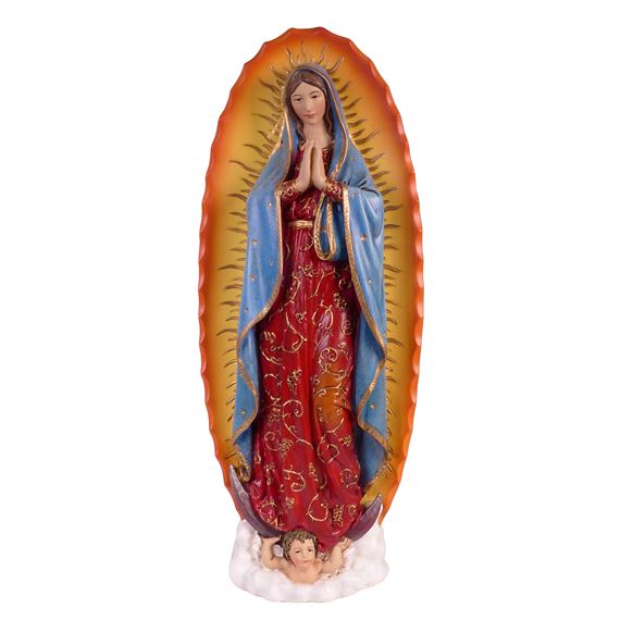OUR LADY OF GUADALUPE STATUE - 11 INCH From the Renaissance Collection, this beautiful statue depicts the Patron of the Americas, Our Lady of Guadalupe. Made of resin, it measures 11".