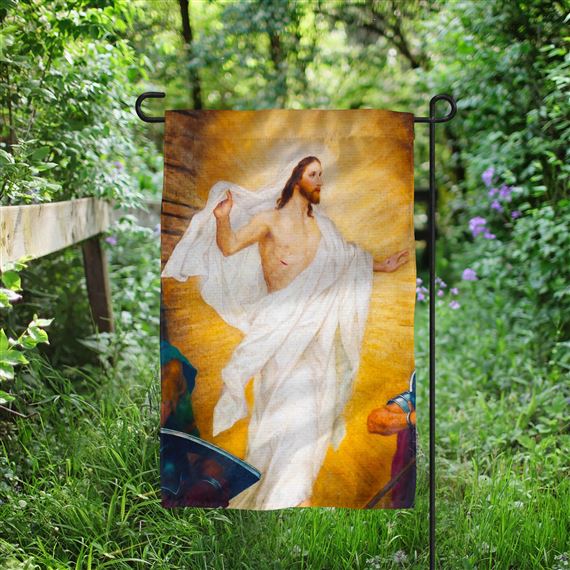 This devotional Garden Flag of the Resurrection a great way to proudly display your Catholic faith in the yard or garden. It is made of 150 denier woven polyester and hemmed around the edges for durability. This fabric can withstand high winds and is more fade-resistant than typical cotton house and garden flags.