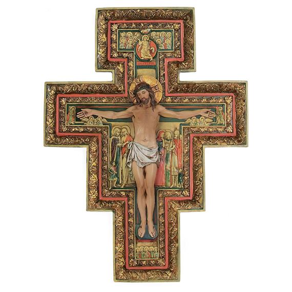 This beautiful three-dimensional rendition of the San Damiano crucifix is made of resin and measures 4½”W x 6"H. Today the original cross hangs in Santa Chiarra (St.Clare) Church in Assisi. It was while praying before this cross that Our Lord gave St. Francis of Assisi the commission to go and rebuild the Church! We celebrate St. Francis' feast day on October 4th.