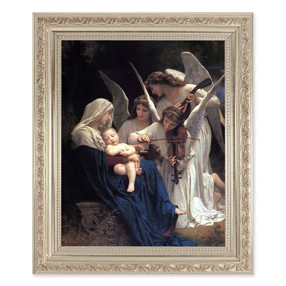 This is a beautiful print of William Adolphe Bouguereau’s painting, La Vierge aux anges (The Virgin with Angels) popularly known as Song of the Angels. It is framed under glass in an antiqued silver finished frame with finely detailed scrollwork. It has a velvet easel back as well as a hook for hanging.