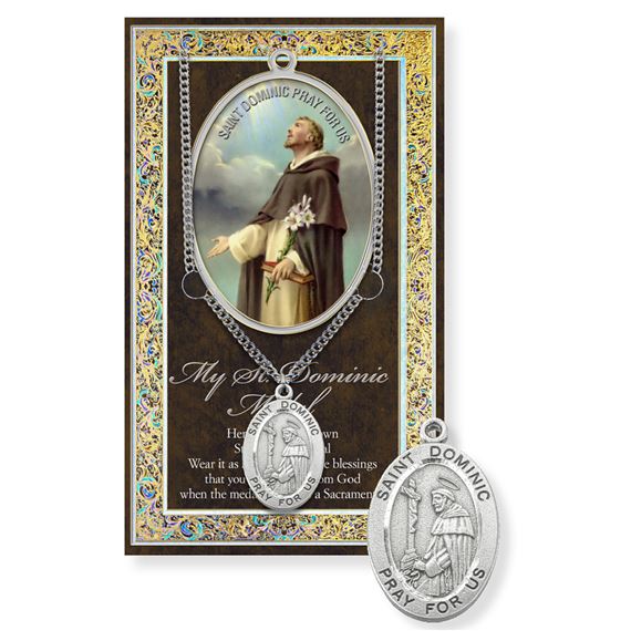 This nicely detailed genuine pewter medal of St. Dominic measures approximately 1½” and comes on a 24” endless stainless steel chain. It is packaged with an embossed pamphlet that contains information about the saint and a prayer.