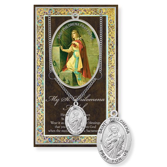 This nicely detailed pewter medal measures 1 1/8” and comes on an 18” stainless steel chain with clasp. It is packaged with an embossed pamphlet that contains information about St. Philomena and a prayer.
