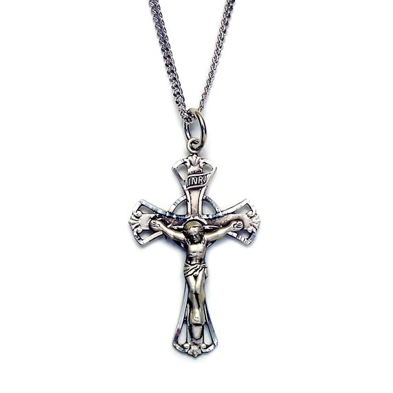 STERLING SILVER CRUCIFIX - SMALL This elegant crucifix is made of sterling silver and measures 1 1/8" on an 18" rhodium chain with a narrow lobster claw clasp.