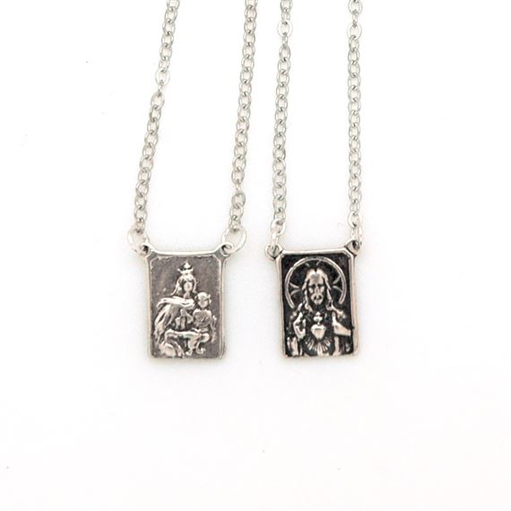 Sterling silver scapular to be worn over the shoulders like a traditional scapular. Each sterling piece (6/16" x 9/16") features the Sacred Heart of Jesus on one side and Our Lady of Mt. Carmel on the reverse. Measures 26".